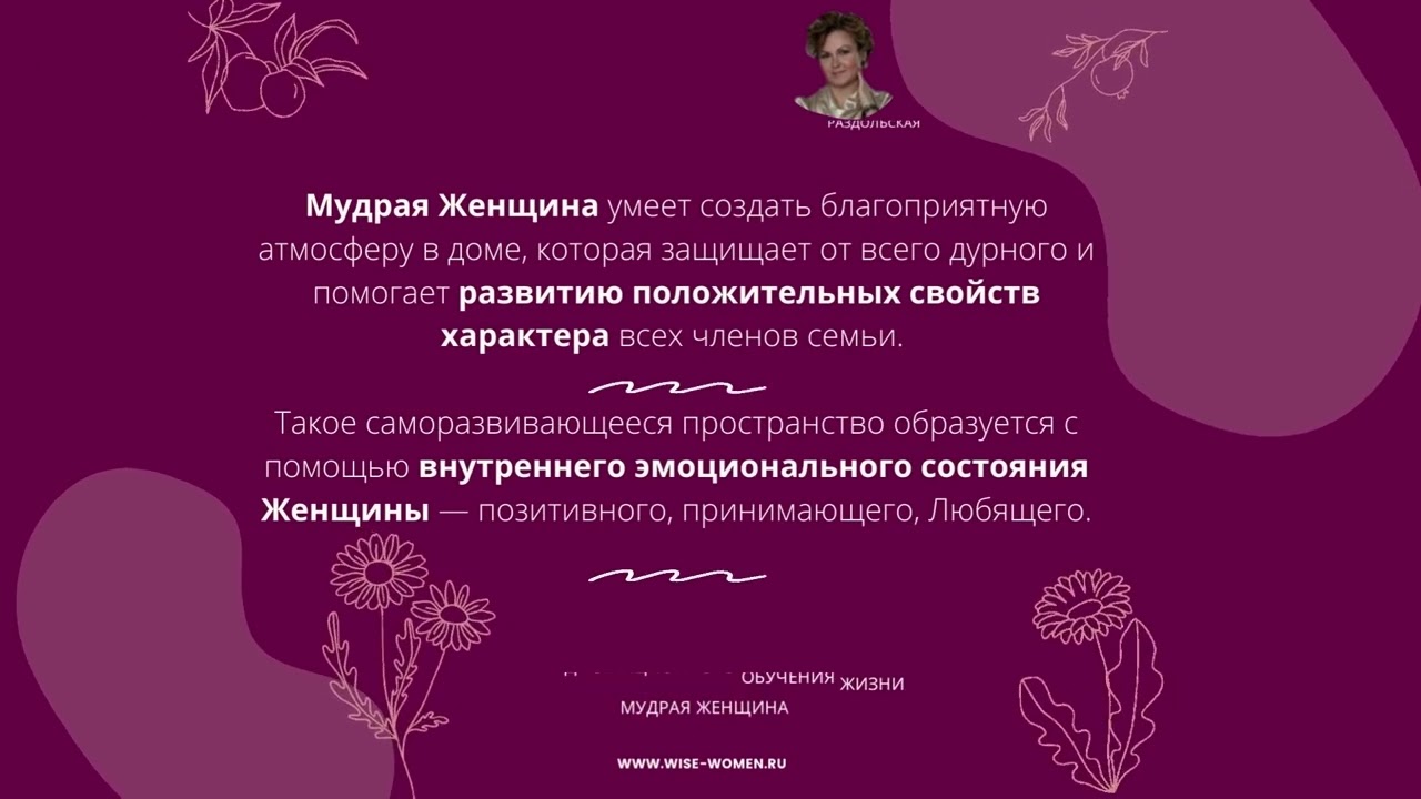 Мудрая Женщина умеет создать благоприятную атмосферу в доме, которая защищает от всего дурного и помогает развитию положительных свойств характера всех членов семьи. Такое саморазвивающееся пространство образуется как с помощью внутреннего эмоционального состояния Женщины — позитивного, принимающего, Любящего, так и благодаря созданию гармоничного и уютного интерьера самого жилища.